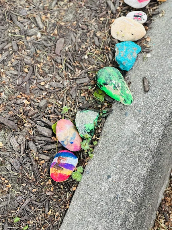 At our Easter Egg Hunt, two bright-eyed neighborhood girls led a delightful rock painting craft. They had already decorated a large rock shaped like a snake’s head and guided the other children in painting smaller rocks, which would later form the snake's body. After the egg hunt, the girls placed the snake in one of our common areas and invited the kids to keep adding rocks, growing the "pet" rock snake over time.